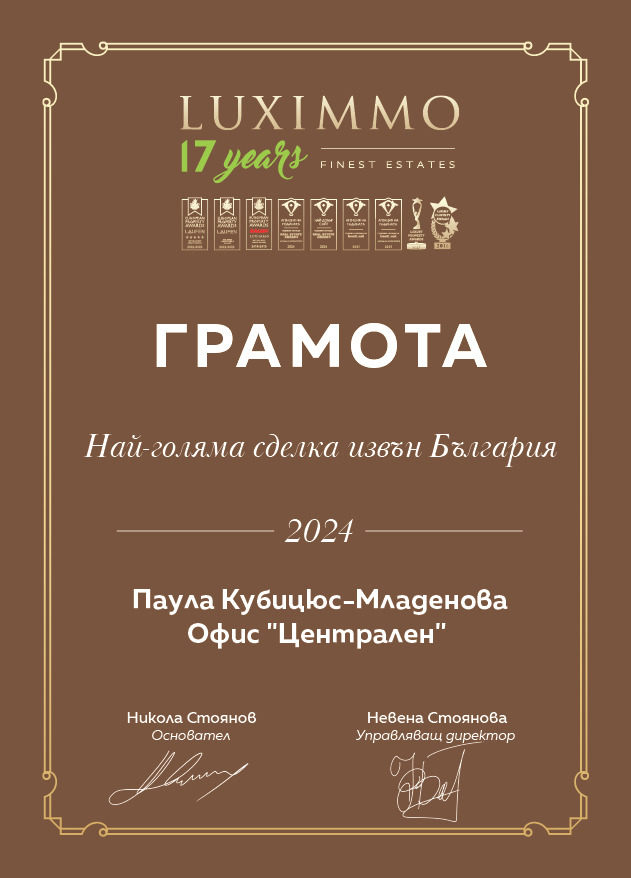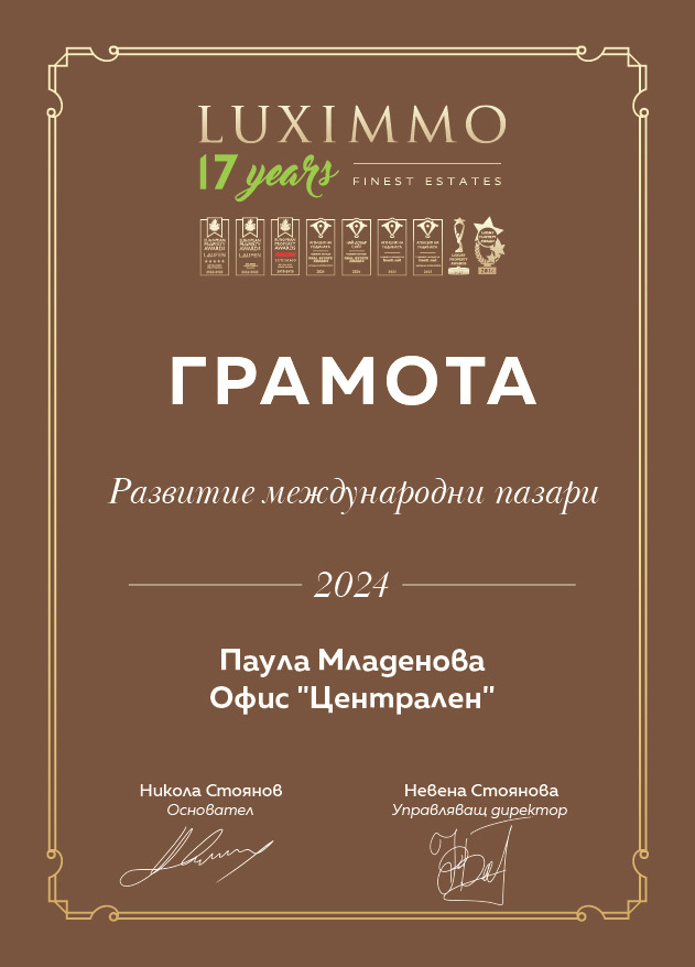 Thanks to her professional skills and extensive experience, Paula has the opportunity to work not only with clients in the Bulgarian market but also with clients in markets such as Dubai, UAE, Greece, and Spain. The new challenges associated with luxury property sales abroad and serving clients with high social status provide her with the chance to develop professionally in new directions within the real estate industry and solidify her position as a leading consultant in the agency.