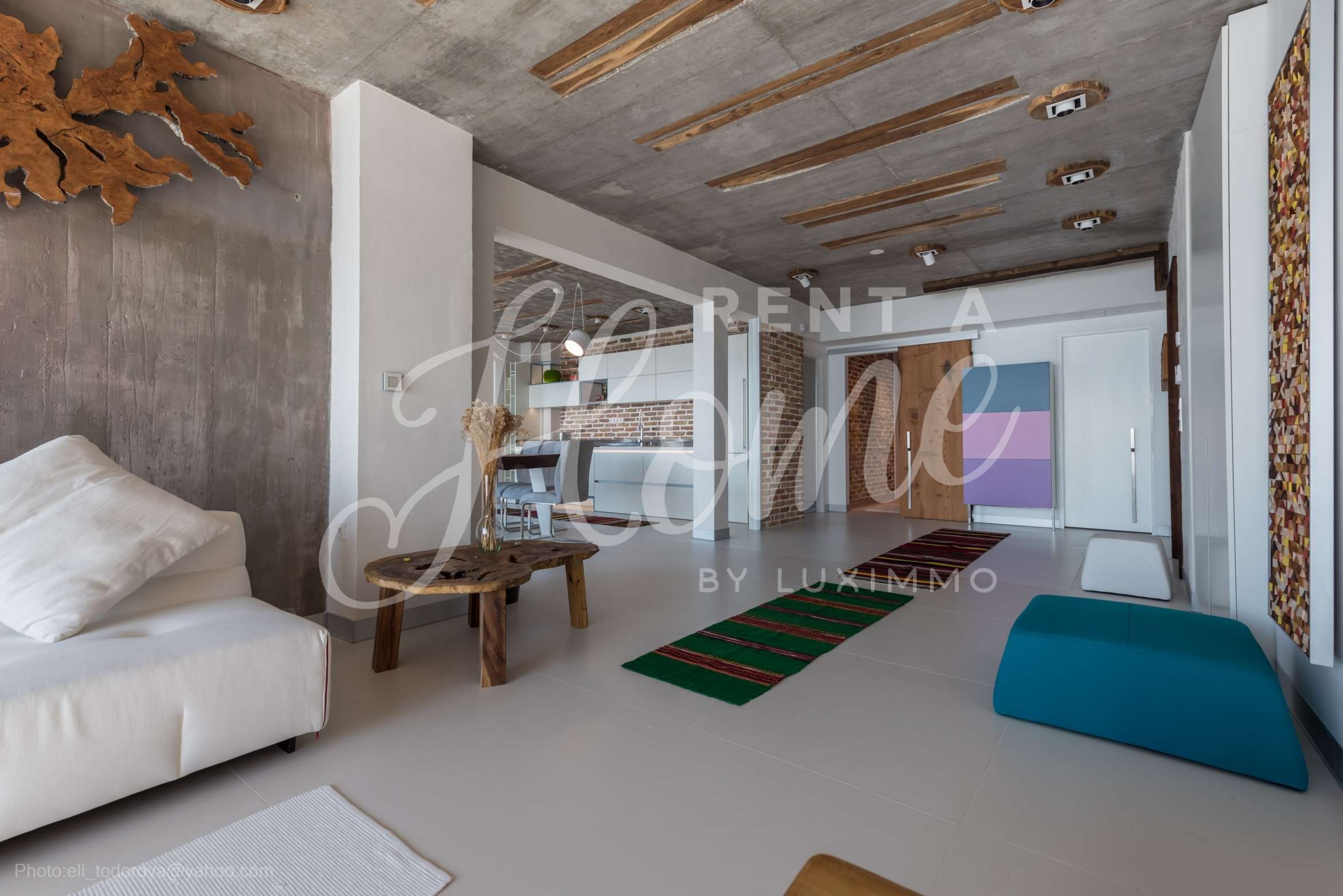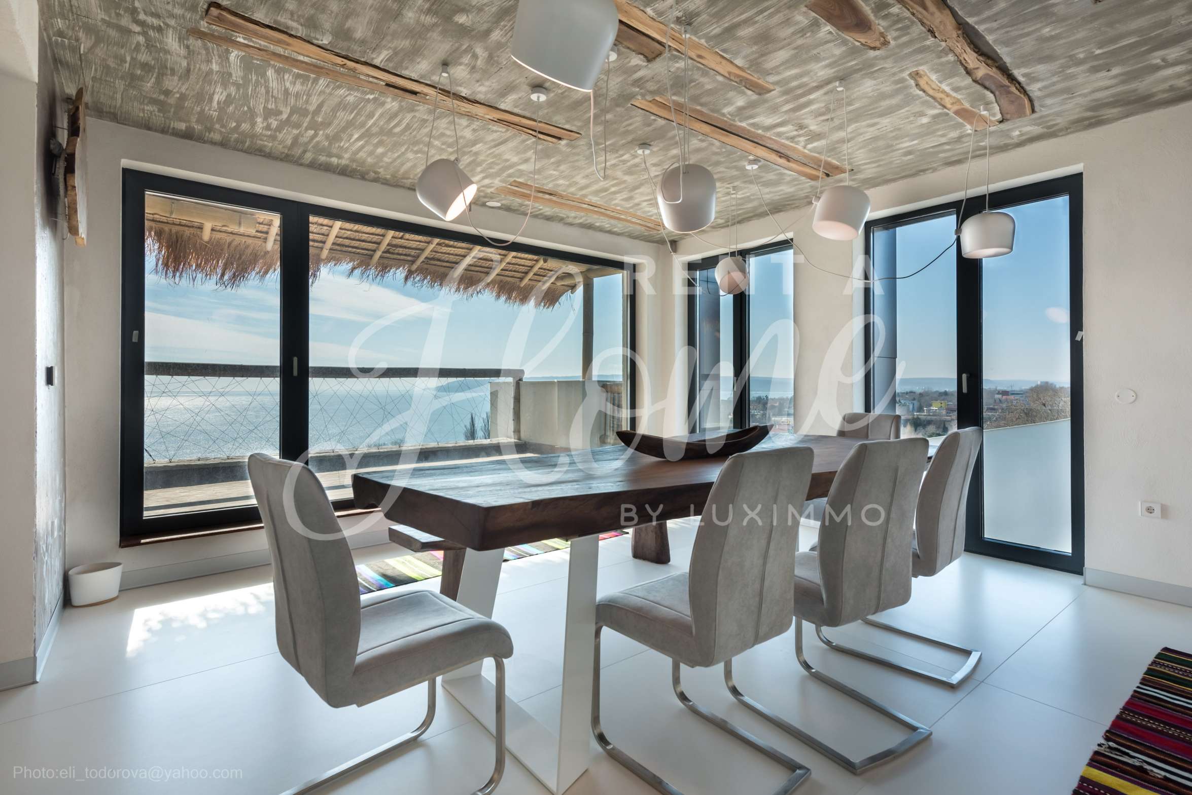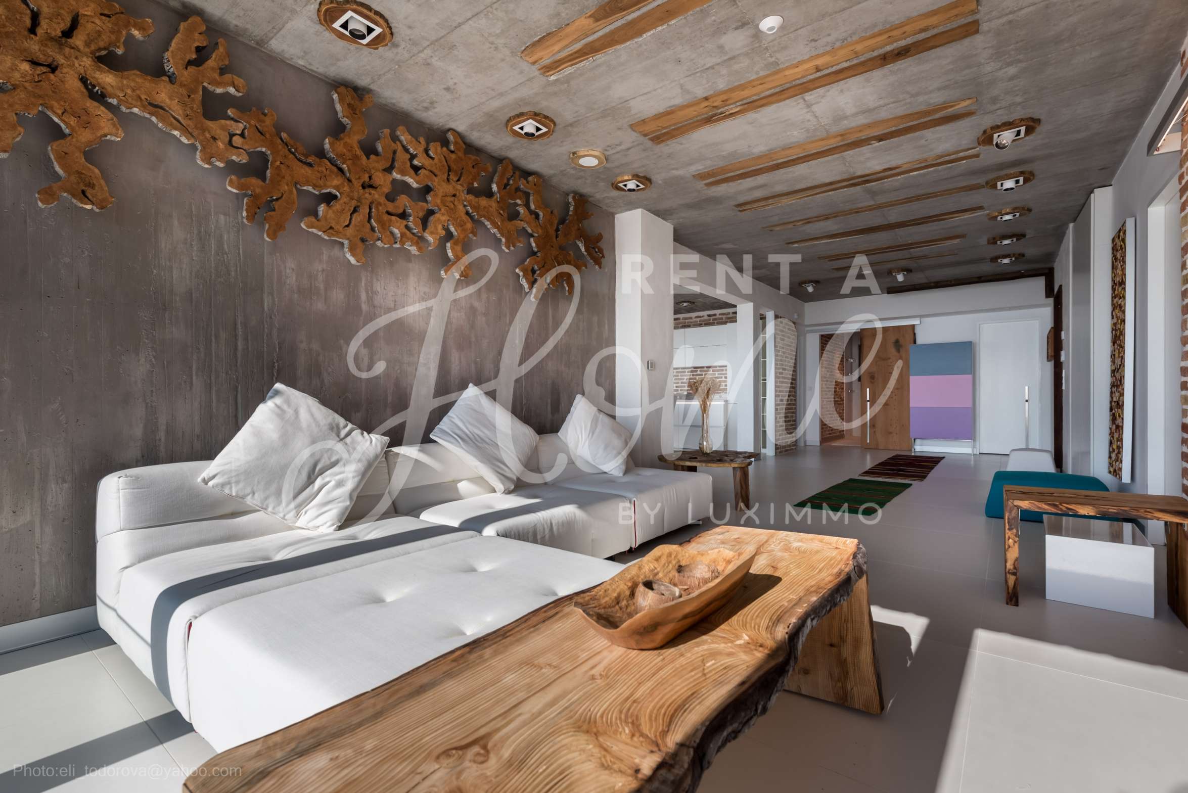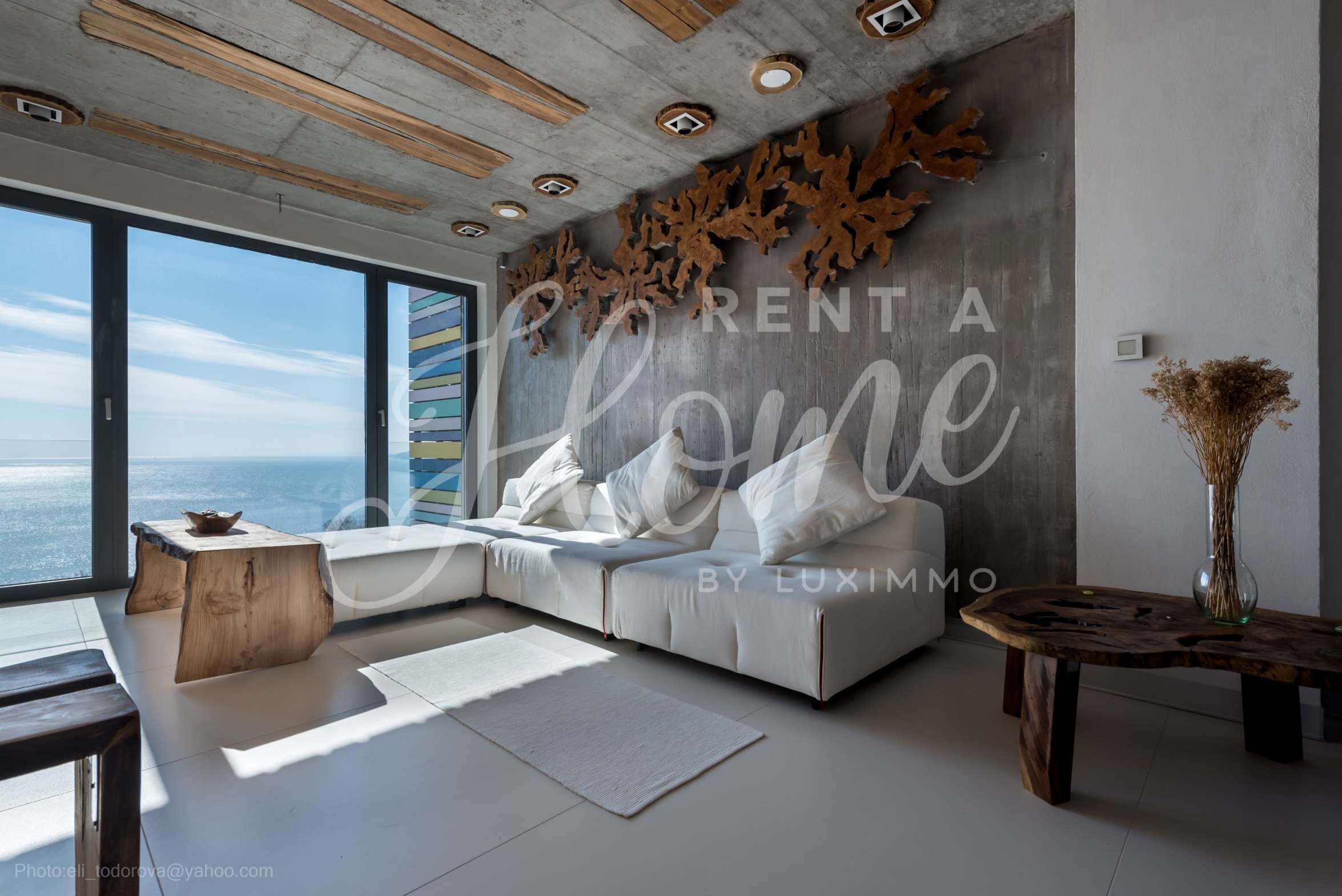 Дизайнът е уникален - естествен и модерен, предизвикателен и светъл, носещ посланието на автономност, релакс и морската атмосфера. В бетоновите плочи по тавана на апартамента са вградени естествени дървени орнаменти от акация. Тухлените стени и бетонът са използвани за естествена декорация, като са допълнително обработени, импрегнирани и грундирани. Мебели, кухня, матраци и дивани, атрактивни плочки, осветителни тела - всички са на известни италиански марки. Вниманието в трапезария е с акцент на екстравагантната маса, изработена по поръчка, от ценно и рядко дърво от Амазонка. Банята е отделена със стъклена врата, за изобилието на слънчева светлина, а всички санитарии са първокласно немско качество.