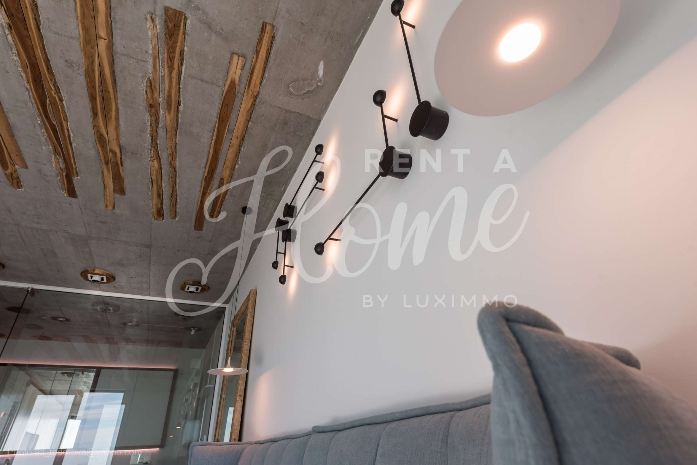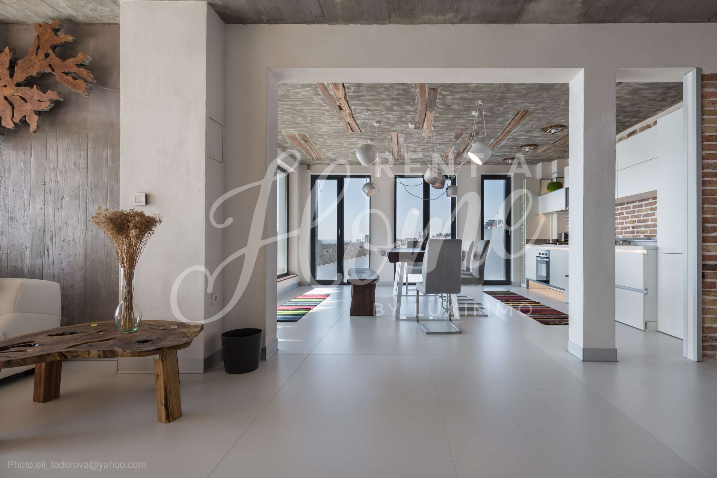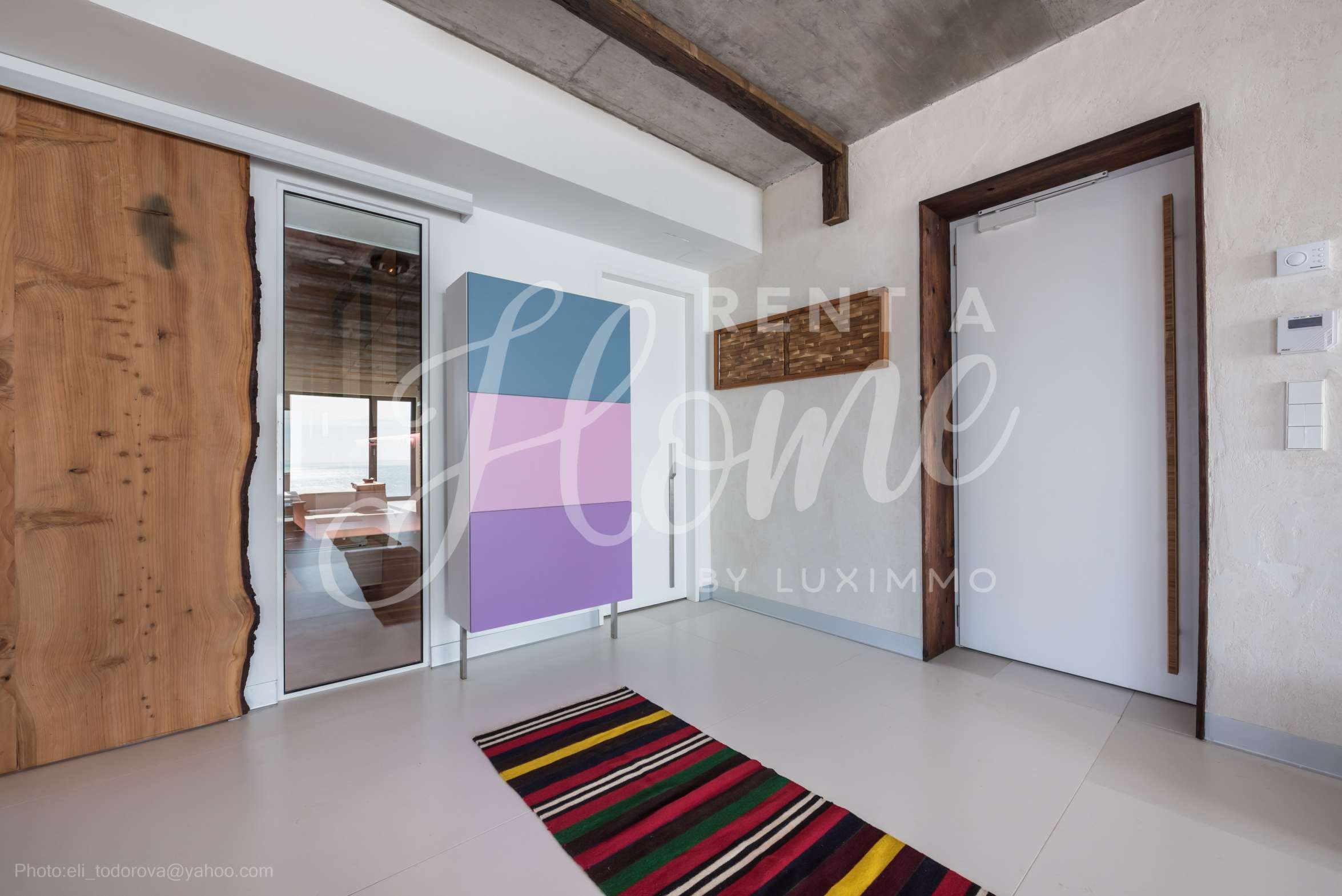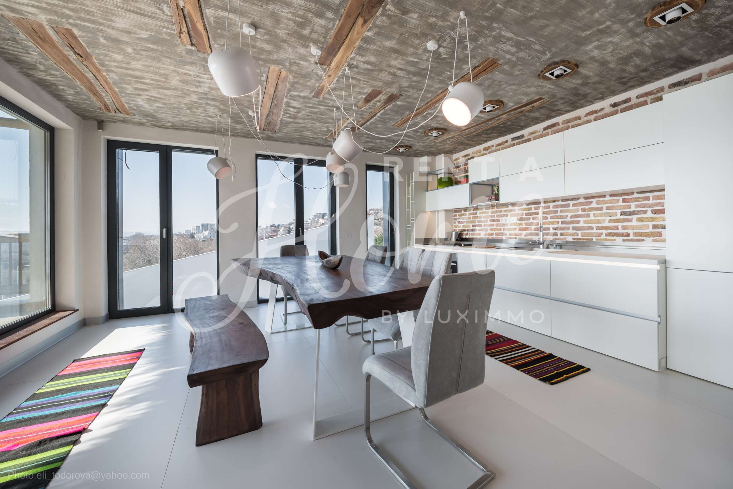 Дизайнът е уникален - естествен и модерен, предизвикателен и светъл, носещ посланието на автономност, релакс и морската атмосфера. В бетоновите плочи по тавана на апартамента са вградени естествени дървени орнаменти от акация. Тухлените стени и бетонът са използвани за естествена декорация, като са допълнително обработени, импрегнирани и грундирани. Мебели, кухня, матраци и дивани, атрактивни плочки, осветителни тела - всички са на известни италиански марки. Вниманието в трапезария е с акцент на екстравагантната маса, изработена по поръчка, от ценно и рядко дърво от Амазонка. Банята е отделена със стъклена врата, за изобилието на слънчева светлина, а всички санитарии са първокласно немско качество.