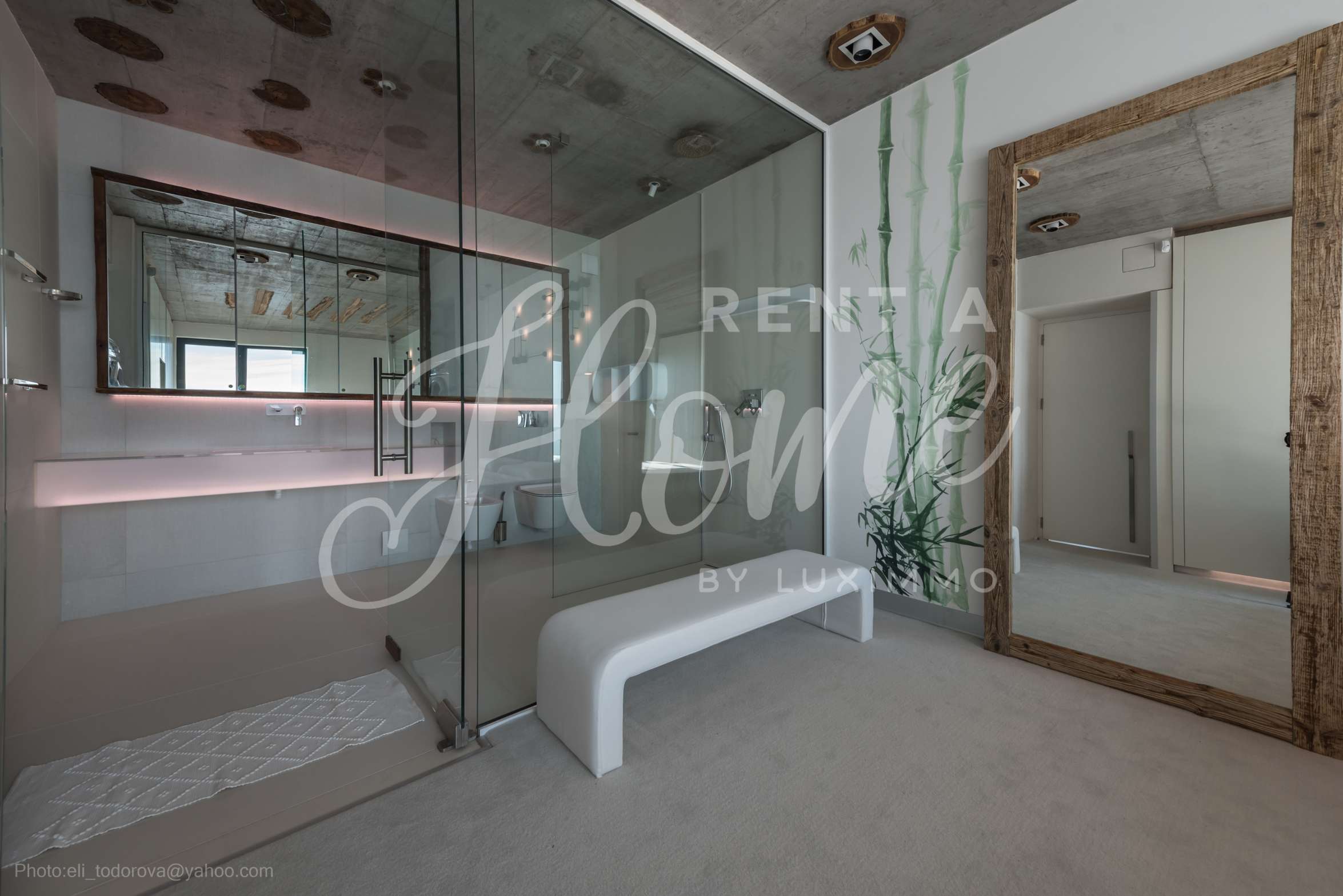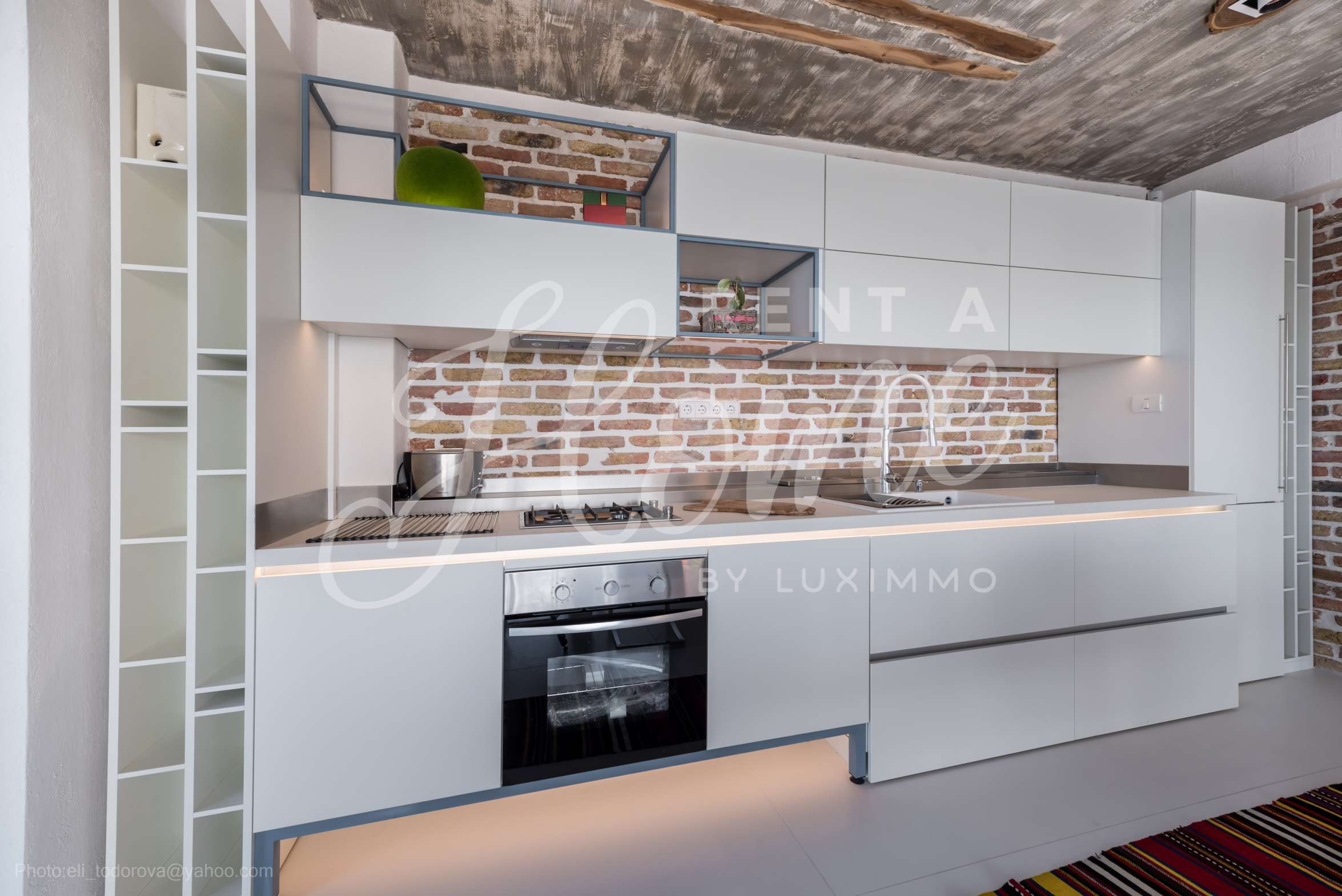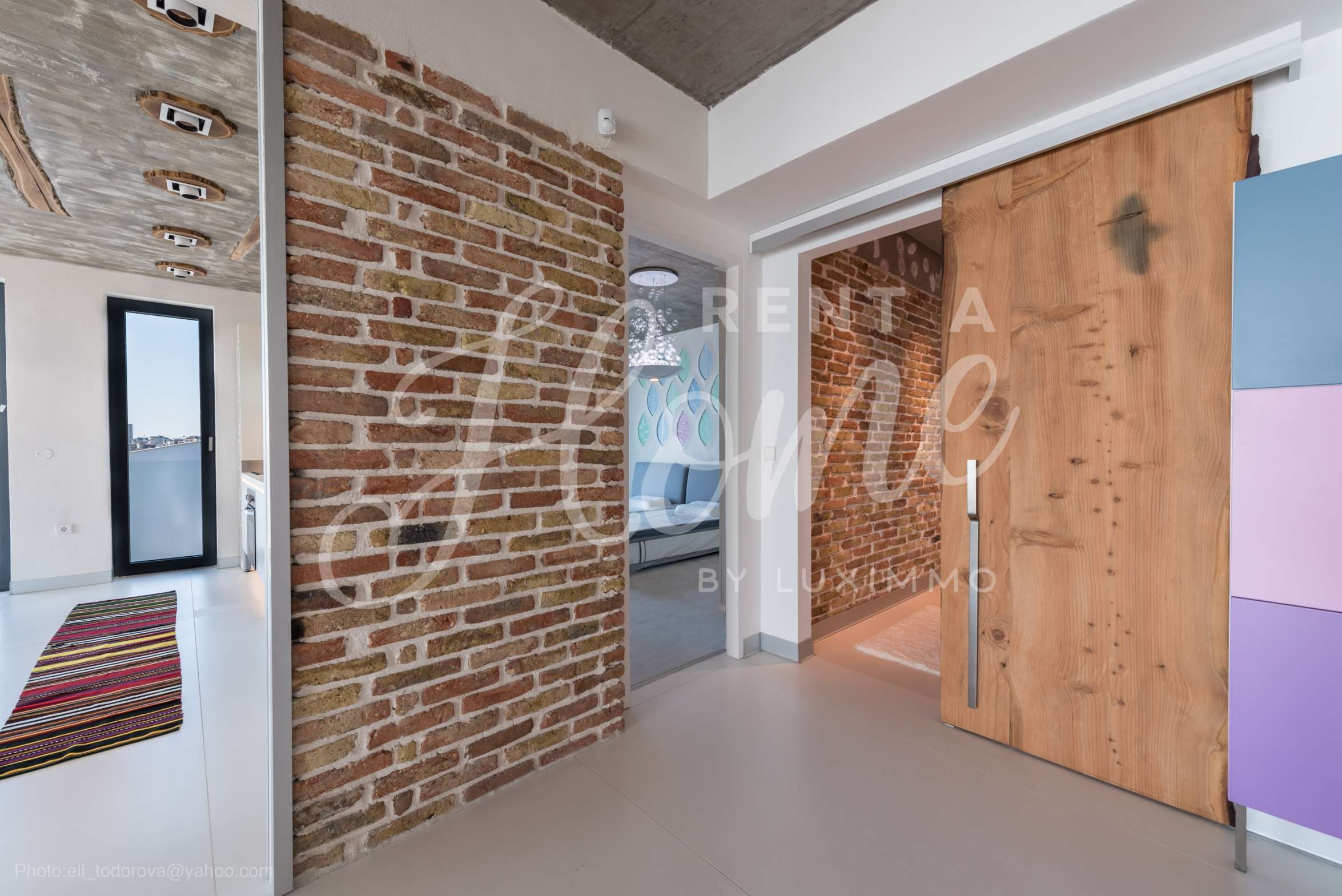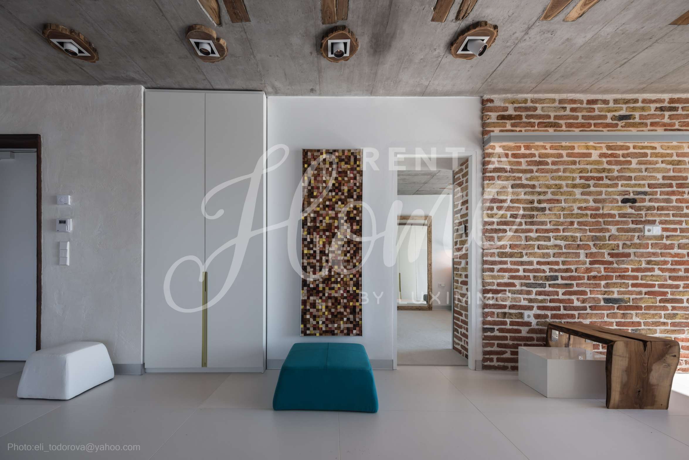 Дизайнът е уникален - естествен и модерен, предизвикателен и светъл, носещ посланието на автономност, релакс и морската атмосфера. В бетоновите плочи по тавана на апартамента са вградени естествени дървени орнаменти от акация. Тухлените стени и бетонът са използвани за естествена декорация, като са допълнително обработени, импрегнирани и грундирани. Мебели, кухня, матраци и дивани, атрактивни плочки, осветителни тела - всички са на известни италиански марки. Вниманието в трапезария е с акцент на екстравагантната маса, изработена по поръчка, от ценно и рядко дърво от Амазонка. Банята е отделена със стъклена врата, за изобилието на слънчева светлина, а всички санитарии са първокласно немско качество.
