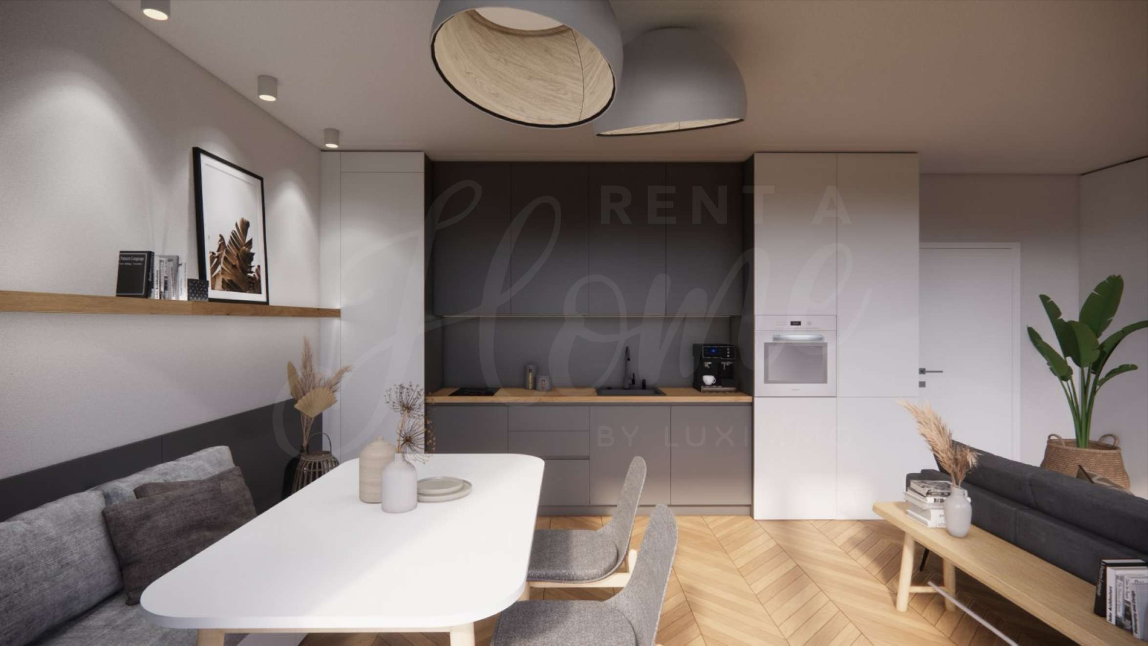 • Просторна дневна с обединени кухня, трапезария и зона за почивка;