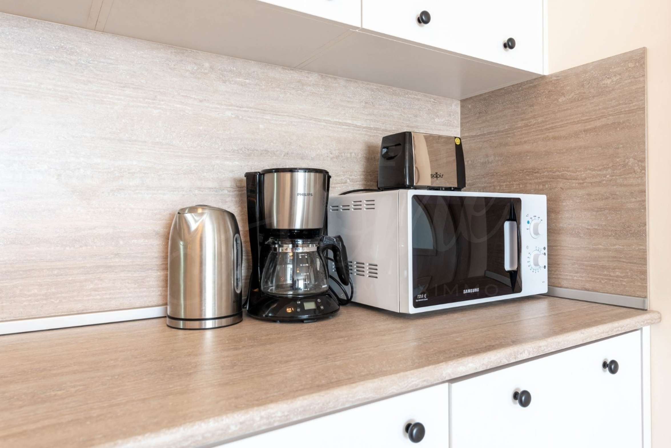 Апартаментът е първокласно обзаведен и оборудван с всичко необходимо за живеене: автоматична пералня, печка и голям хладилник, ТВ, бойлер и др. Интериорът е решен в светли тонове, със съвременни мебели и техника, и във всички стаи има монтирани климатици.