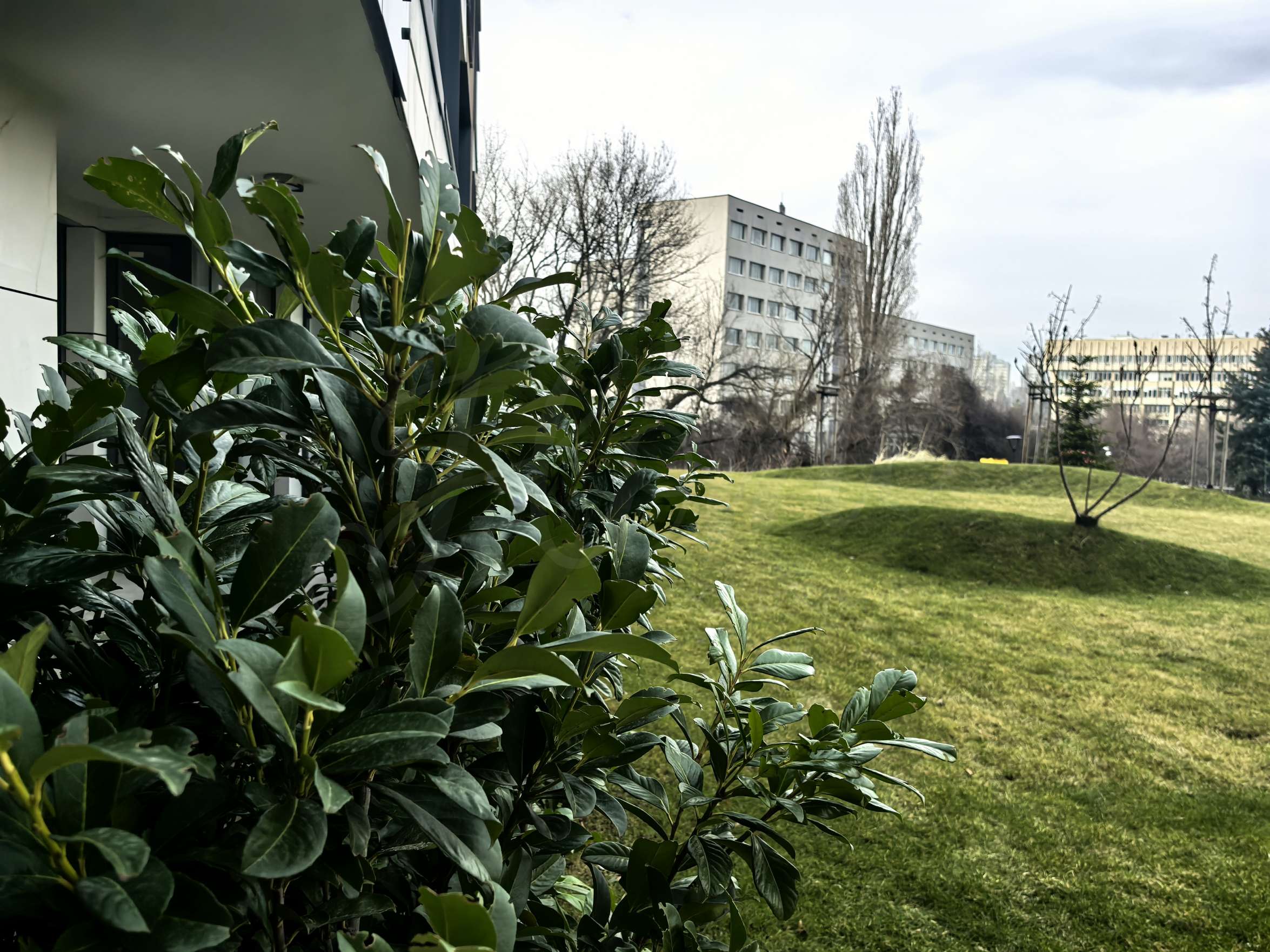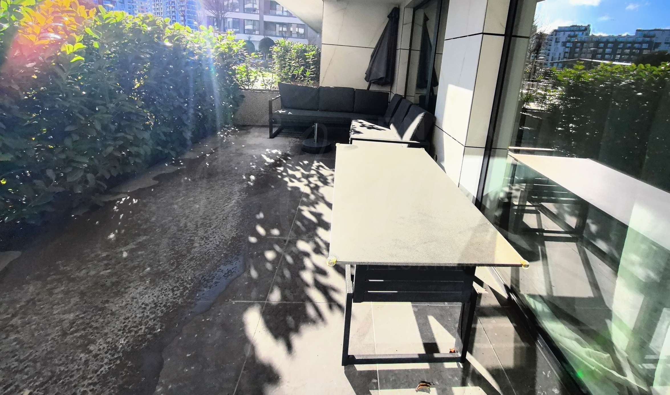 • Към апартамента има самостоятелен двор-веранда, обзаведен с ъглова мека мебел и чадър – идеално място за сутрешно кафе, работа на открито или спокойни вечери през топлите дни.