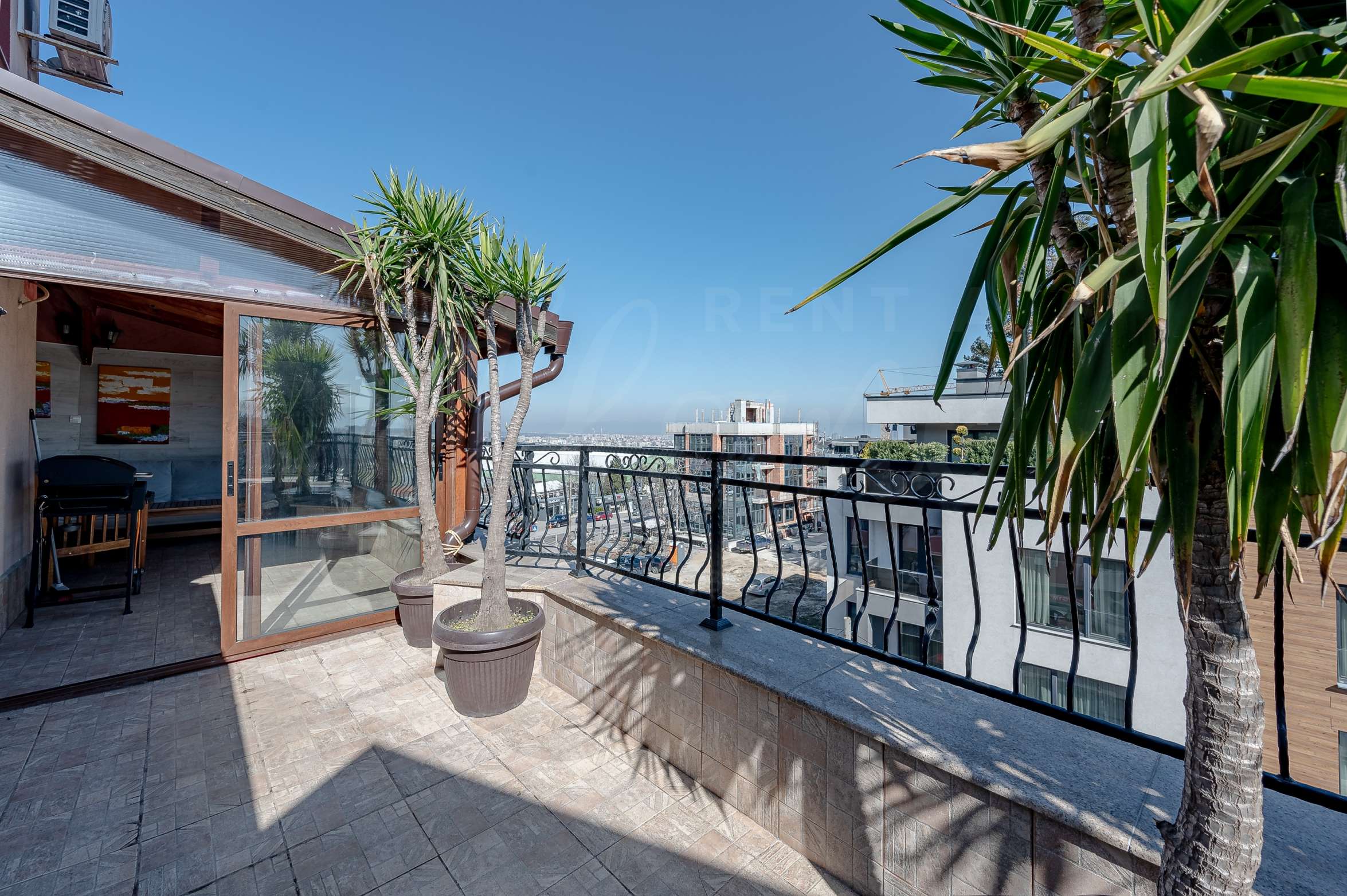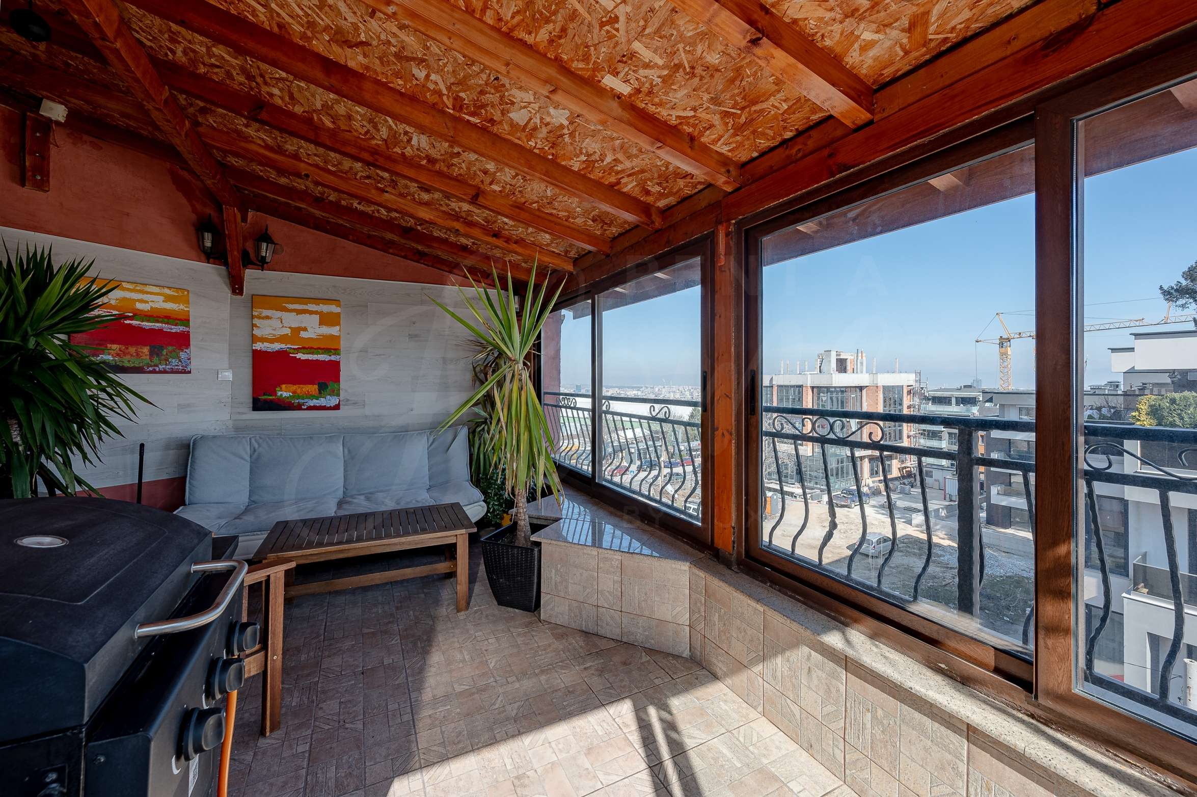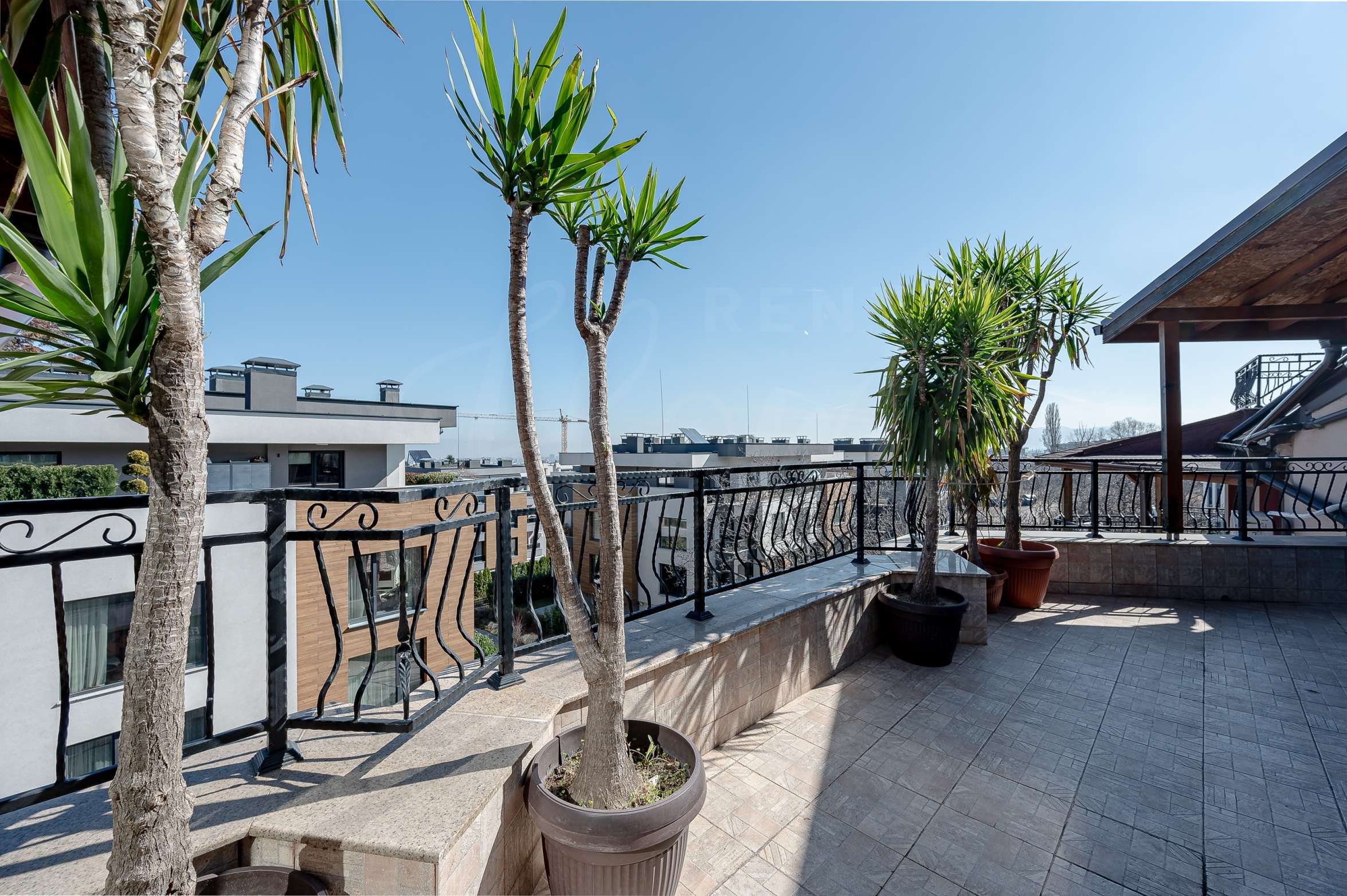 Апартаментът е с обща площ 165 кв.м, като вътрешната жилищна площ е 102 кв.м, допълнена от зимна градина и няколко просторни тераси, които естествено разширяват жилищното пространство.